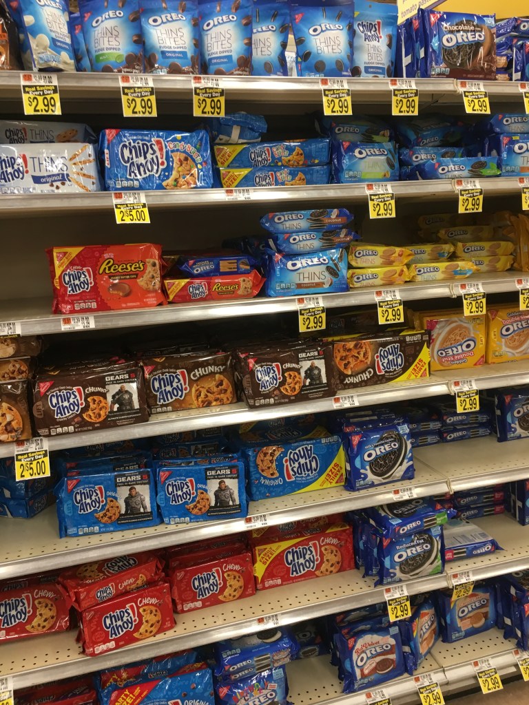I was assigned to research and design a cookie or candy product, the cookies were shelved with crackers and juice and other snack items. Candy was shelved with sodas iced tea water and other beverages. the packaging for these type of products have lots of movement bold colors and large logos and stylized typography. Cookies and candy were placed in adjacent aisles in the center of the store